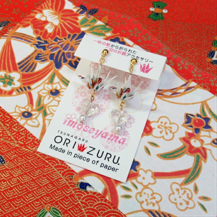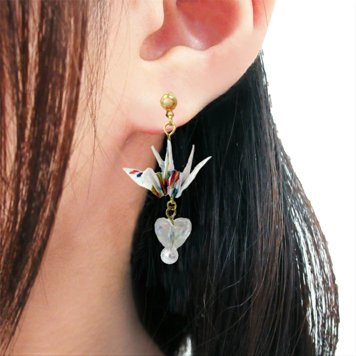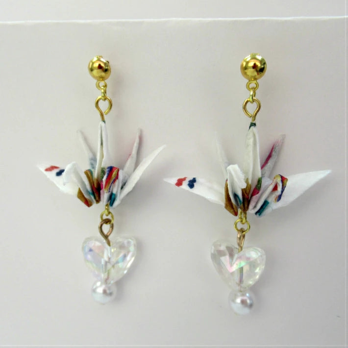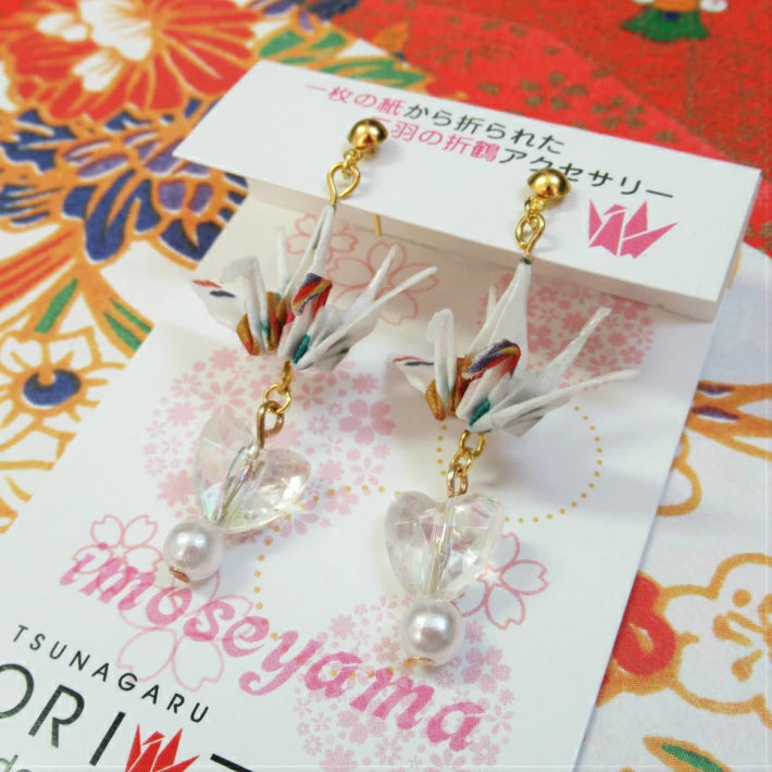 TSUNAGARUORIZURU ハンドメイドアクセサリー折鶴ピアス【妹背山・白・ハートビーズ付・一点物】(妹背山 連鶴 折鶴 結婚式 アクセサリー 手作り ピアス TSUNAGARU ORIZURU 和雑貨 和小物 着物 浴衣 )